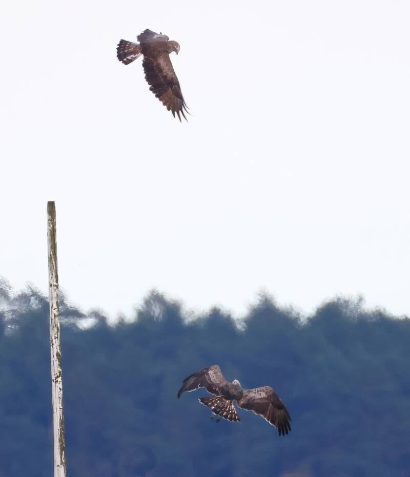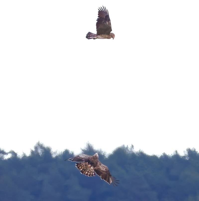 Beide Schlangenadler in der Dämmerung.