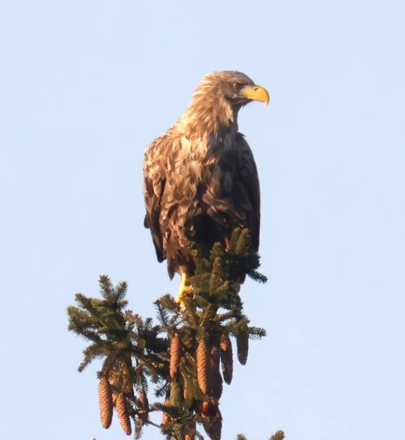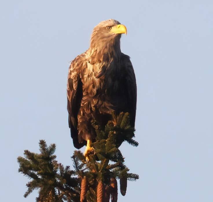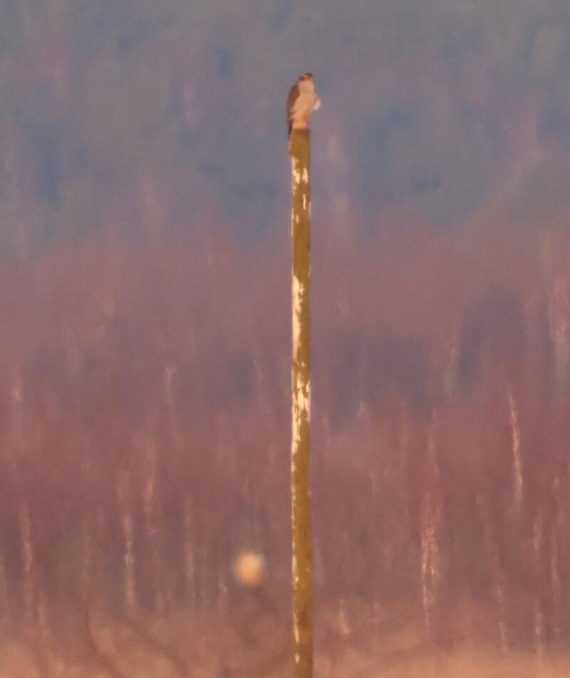 Zur Abendstunde ist er in Gefahr. Ein Habicht sitzt im Hintergrund.
