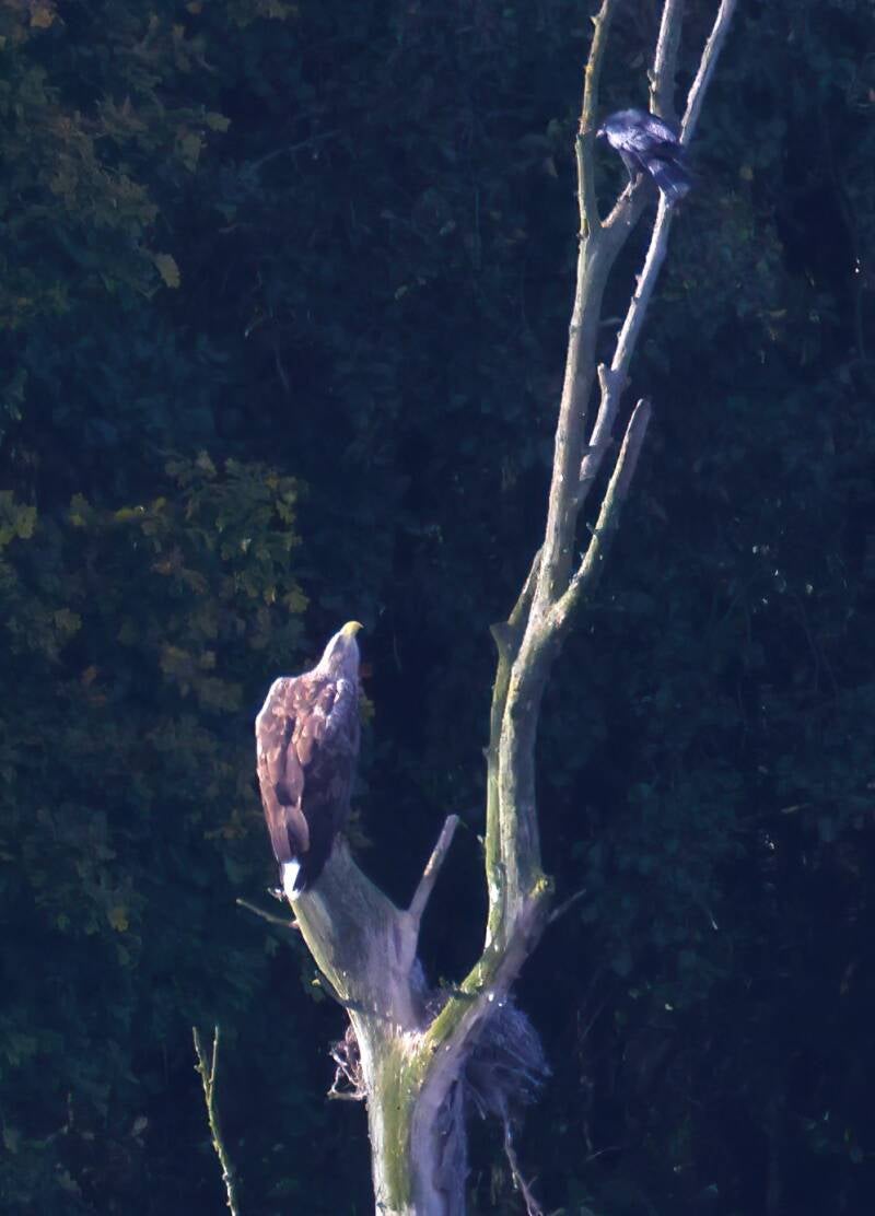 Der OS-Seeadlerterzel wird von einer Rabenkrähe geärgert.