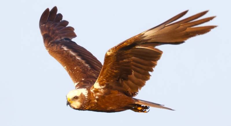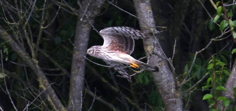 Weibliche Kornweihe im Jagdmodus.