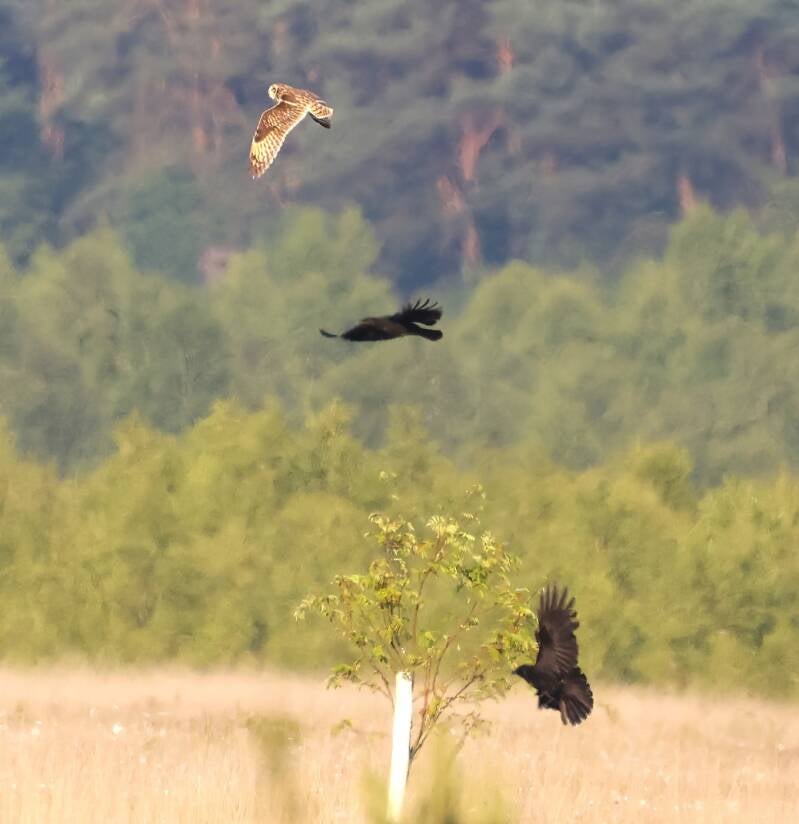 Die hiesige Sumpfohreule legt sich mit gleich zwei Rabenkrähen an.