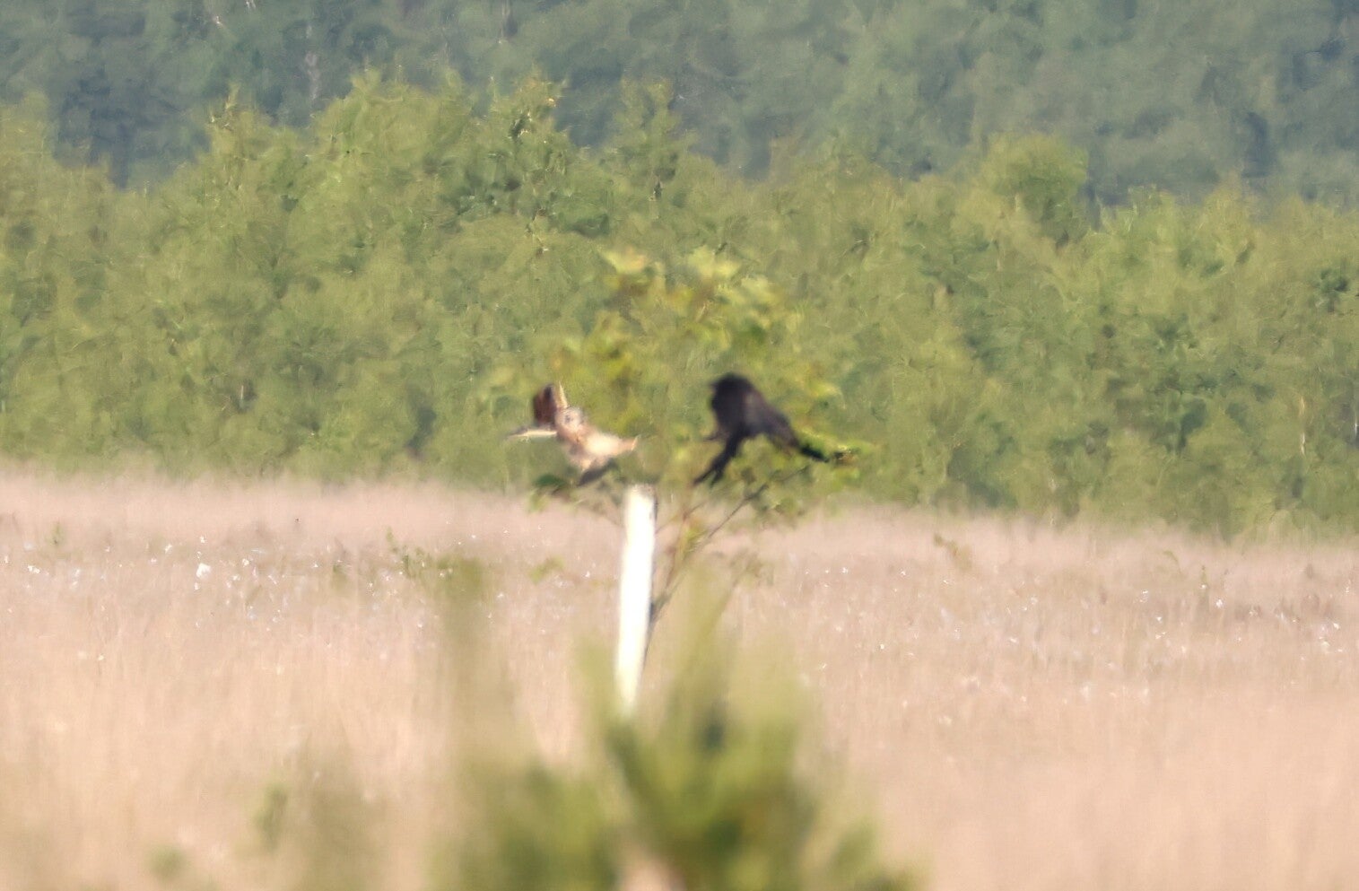 Die tritt die Krähe regelrecht vom Pfosten. Der Brachvogel attackiert die Steppenweihe. (Belege)