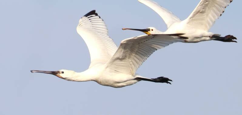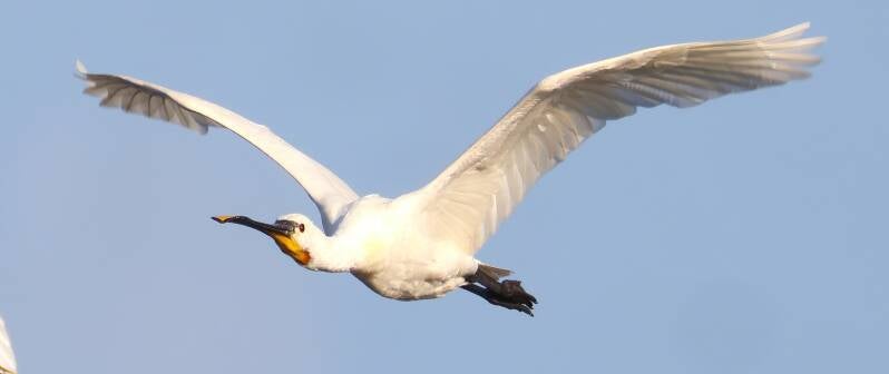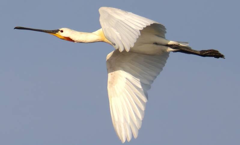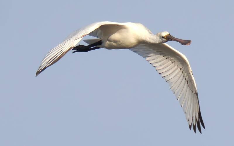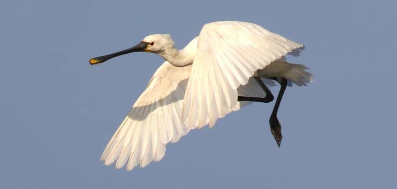 Die jungen Löffler haben schwarze Flügelspitzen und relativ helle Schnäbel.