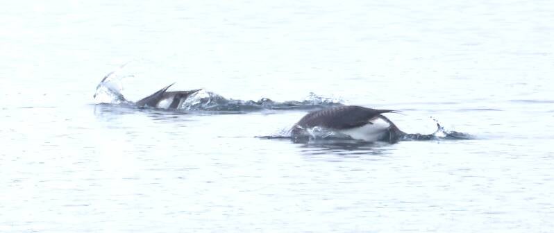 In der Dämmerung noch die beiden Prachttaucher. Die Eisente ist auch noch vor Ort.