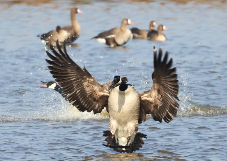Diese Blässgans gibt alles, um noch schnell weg zu kommen. Zwei Supergreifer sind im Anmarsch. Beide sind noch sehr jung, aber brandgefährlich. Morgen Teil 2.