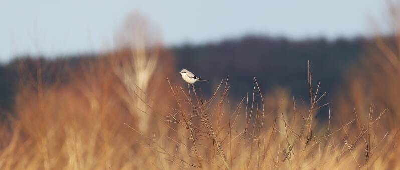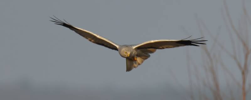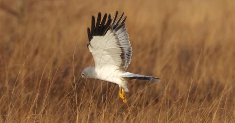 Das Kornweihenweibchen jagt im Hintergrund.