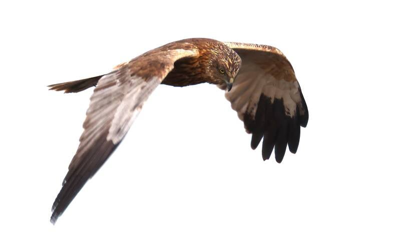 Die hochkonzentrierte Rohrweihe beim Jagen.